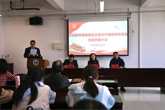 为创新特色党建工作,切实提升基层党建工作质量水平,4月2日下午2点在主楼C606会议室,外国语学院党委与体育教学部直属党支部举办支部共建大会。会议由外国语学院党委副书记马冬主持,体育教学部及外国语学院领导班子、理论学习中心组成员及双方师生党员、入党积极分子代表参与此次会议。