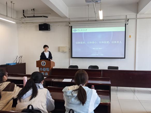 体育教学部直属党支部教工第二党小组张妍为外国语学院本科生党员、入党积极分子代表,以《以体强身、以体强心、以体促健、以体育人》为主题,开展体育健康知识宣讲,讲座通过理论和案例相结合,生动地为同学们开展了一堂“健体、修身、养性”的体育健康知识公开课,教育引导同学们强健体魄、全面发展。本次讲座介绍了大学生体质健康测试各项项目的训练要点,对学生们训练方法进行科学指导,引导同学们树立正确的健康观念,提高健康素质。在最后的问答环节,同学们积极提问,师生共同讨论了短跑手臂摆动方式、体测后身体拉伸方法等问题,氛围热烈融洽,同学们收获颇丰。