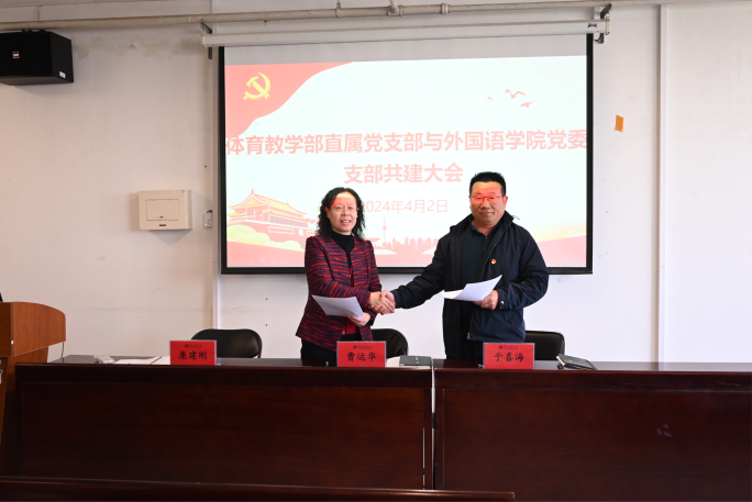 体育教学部直属党支部书记曹运华、外国语学院党支部书记于喜海及外国语学院院长康建刚共同签署《党支部共建协议》。双方将以此为契机,充分发挥各自党建、专业优势,持续深化党建、事业合作交流,共同推动双方在党建提升、人才培养及品牌创新等方面取得更多实质性成果。