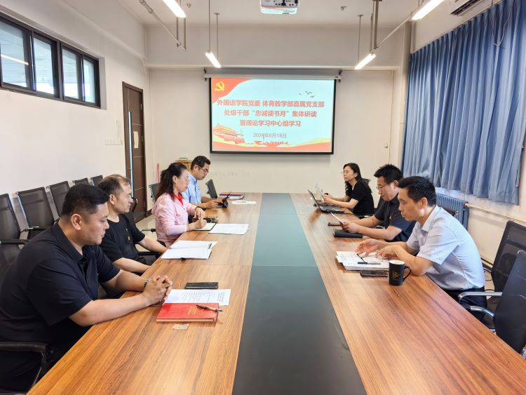 2024年6月18日14时,外国语学院党委与体育教学部直属党支部在主C701开展处级干部“忠诚读书月”集体研读暨理论学习中心组学习,全体处级干部参加。