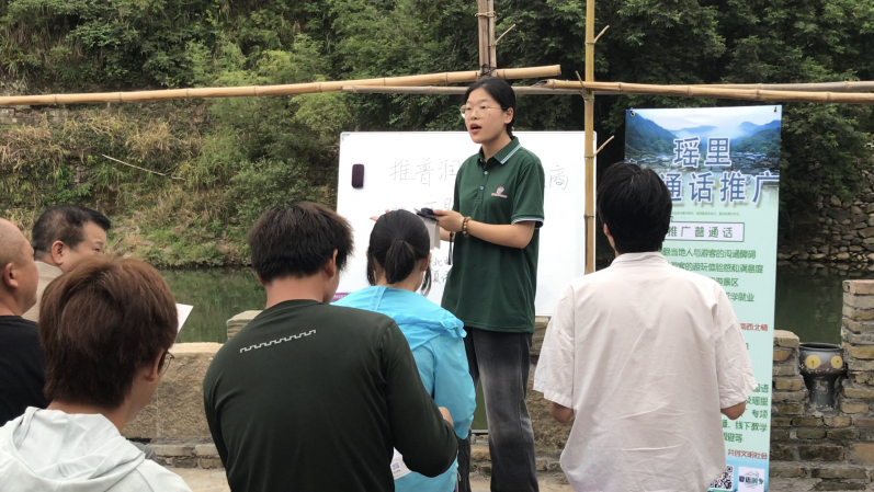 瑶里中心学校是本次推普实践的主要阵地,团队成员在此开办暑期推普拓展班,讲解普通话专业知识,设置推普图书角,开展“典耀中华”读书活动和线上经典朗诵比赛,丰富当地学生的假期生活,也让普通话推广走进乡村校园。