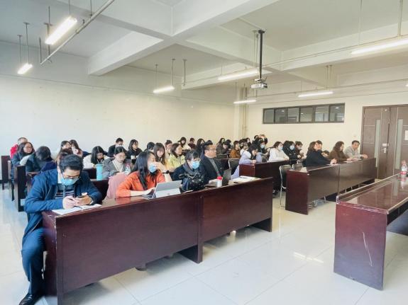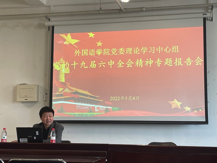 为深入学习贯彻党的十九届六中全会精神,引导全体师生切实把思想和行动统一到全会精神上来,切实将智慧和力量凝聚到推动学院事业高质量发展上来,2022年1月4日14时在主C606,外国语学院党委邀请张天兴教授,开展了题为《党的三个历史决议、特点、启示》的理论学习中心组专题学习报告会。学校庆祝建党百年和党史学习教育巡回指导组第三组联络员张凯和马新科,学院党委委员、领导班子、各教师支部书记等五十多名师生党员共同参加学习。宣讲会由学院党委书记于喜海主持。