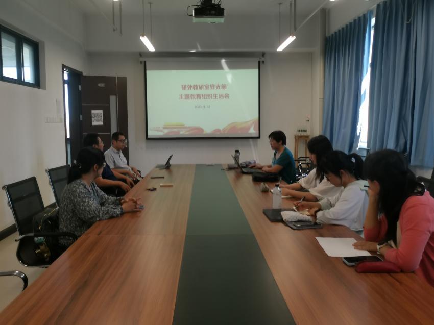 为推动学习贯彻习近平新时代中特色社会主义思想主题教育不断走深走实,根据校党委和学院党委的部署安排,研究生外语党支部于9月12日中午组织开展主题教育专题组织生活会活动。会议由支部书记尹宇主持,全体支部党员参加。学院党委书记于喜海参加本次会议,与支部党员们一起学习讨论、检视剖析、交流思想。