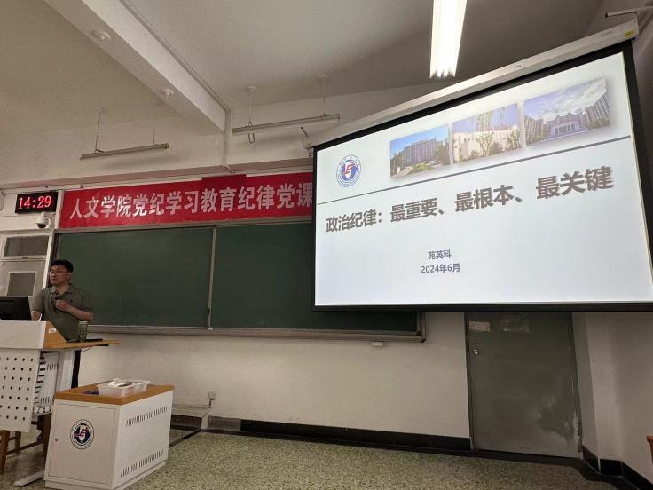 2024年6月11日下午,外国语学院党委委员参加人文学院党纪学习教育,观摩了人文学院党委书记苑英科讲党课活动,党课题为《政治纪律:最重要、最根本、最关键》。