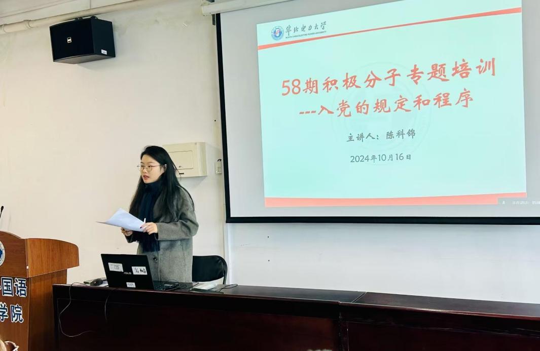 为深入学习习近平新时代中国特色社会主义思想,贯彻党的二十届三中全会精神,加强入党积极分子对党员发展工作流程的了解,2024年10月16日13:00,外国语学院第五十八期入党积极分子培训班党课第三讲开课,辅导员陈科锦主讲,入党积极分子全员参加。