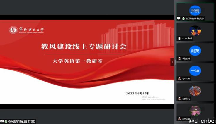 6月15日,在前期文件学习的基础上,大英一教研室召开线上教风建设专题研讨会,会议由教研室主任张倩主持。会议开始,张倩老师再次领学了教风建设相关重要文件,例如高教司吴言司长的重要讲话精神以及学校有关教学方面的文件和专家讲座等。通过对文件的学习,全体教师更加明晰了教风建设的内涵与加强教风建设的重要意义。随后,教研室全体教师就自身存在的教学、教风方面的问题及努力的方向进行深入剖析。各位老师均提到要对照“四有好老师”标准进行自我审视,在关爱学生、了解学生学习需求的基础上进行教案建设和课程思政的建设工作,努力提升个人教学科研水平,全面提升教学质量。