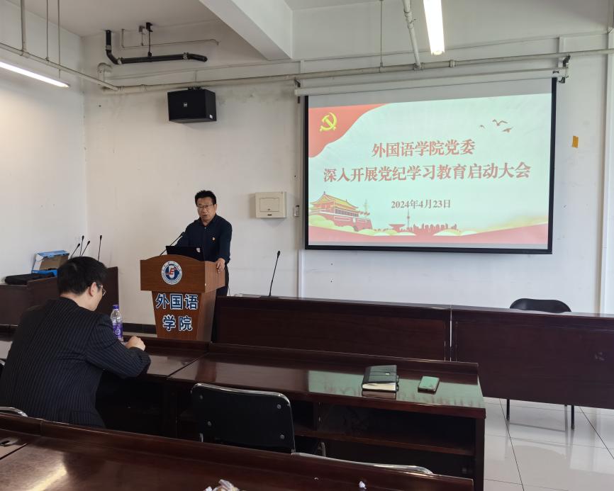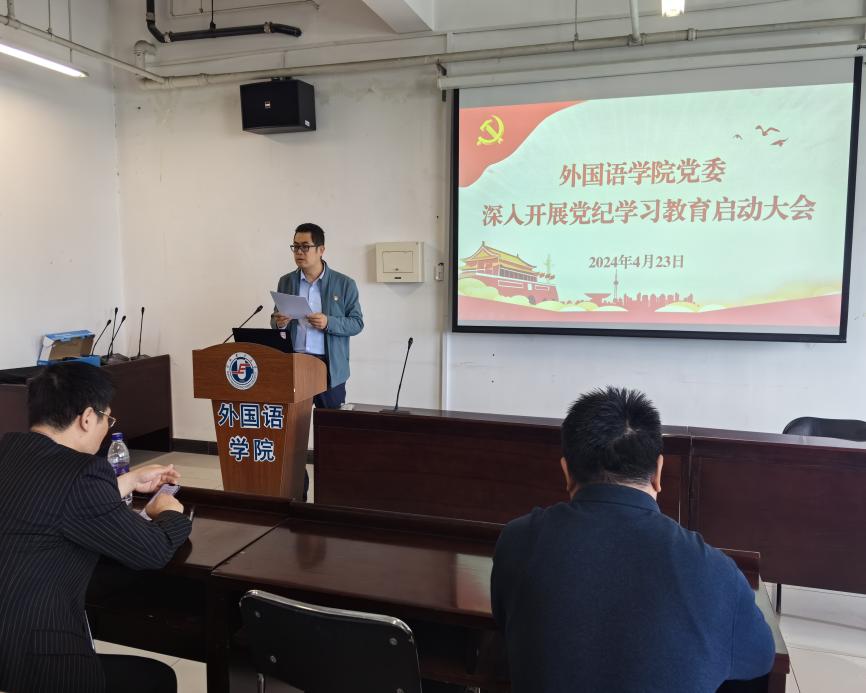 4月23日下午,外国语学院党委深入开展党纪学习教育启动大会在主C606会议室举行。学院领导班子、党委委员及师生党支部书记共同参加会议。会议由学院党委副书记马冬主持。