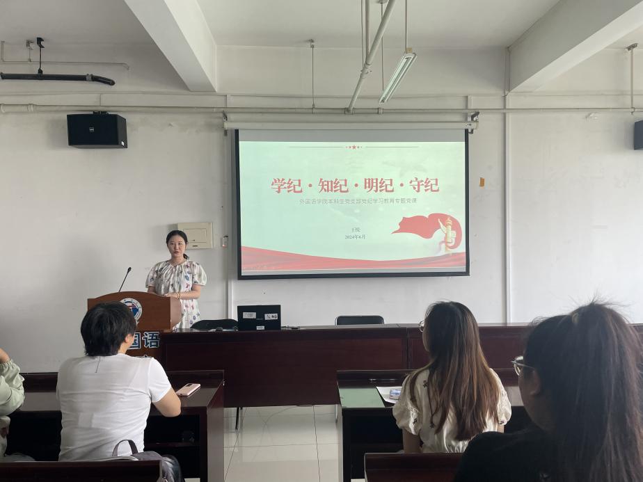 为进一步强化学生党员的纪律意识,提升党性修养,6月19日下午2:30,外国语学院本科生党支部在主C606会议室举办了“学纪·知纪·明纪·守纪”党纪学习教育专题党课,由党支部书记王悦主讲,学院党委委员尹宇、党支部全体党员、本科生发展对象和积极分子代表参加学习。
