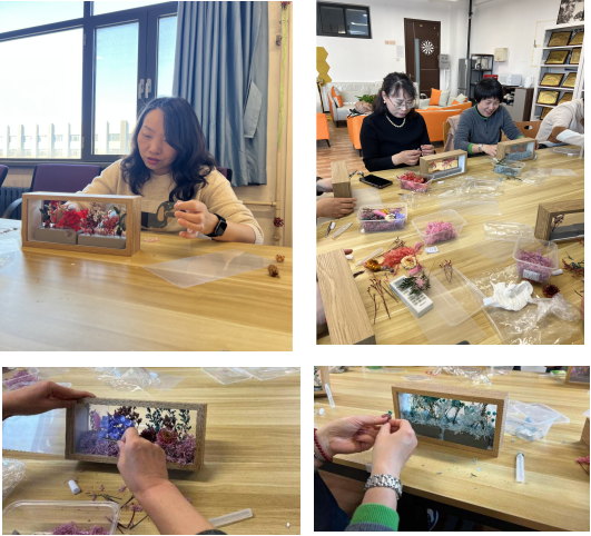 活动现场,花香四溢,气氛温馨。通过观看制作永生花相框的视频讲解,让女教职工们了解永生花的特点、制作技巧以及相框装饰的要点。随后大家充分发挥想象力和创造力,精心挑选花材,用心搭配色彩,将一朵朵干花巧妙组合,制作成独一无二的永生花相框作品。