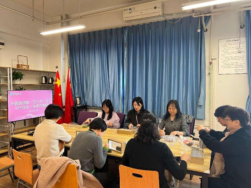 为庆祝第115个“三八”国际劳动妇女节,丰富女教职工的精神文化生活,2025年3月5日12:30在主C612“语嫣”工会小家,外国语学院分工会开展了“指尖绽放美丽,永生花相框DIY”主题活动。学院20余名女教职工参加了此次活动。