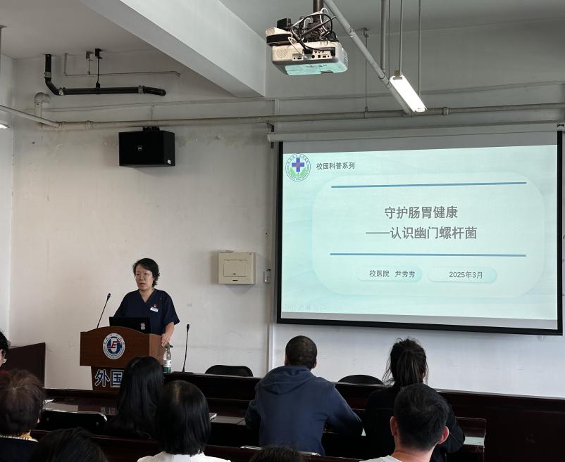 4月16日下午,外国语学院分工会联合华北电力大学校医院举办健康专题系列讲座,特邀校医院副主任医师尹秀秀、主治医师元莎莎,分别围绕幽门螺杆菌防治和科学身材管理展开讲解。学院党委书记郑凯,党委副书记、分工会主席马冬,副院长刘辉,副院长张倩与学院六十余名师生共同参加活动。讲座由马冬主持。