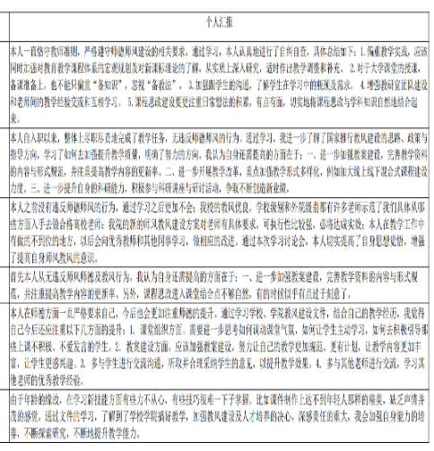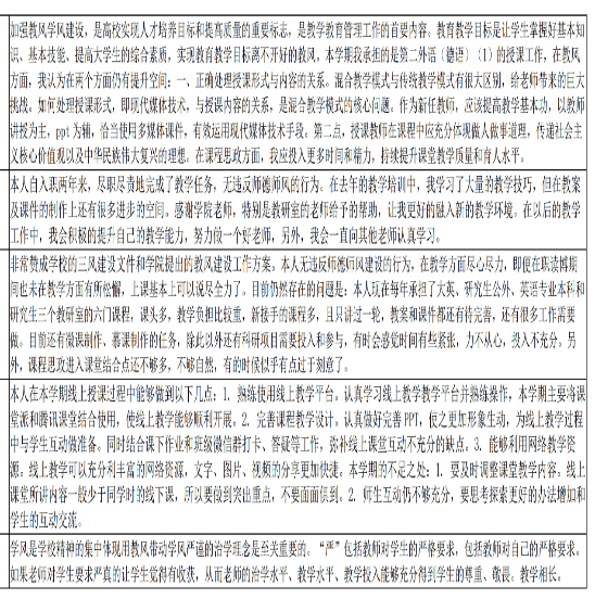 会后,教师们把会议上自纠自查的发言以书面形式进行了总结。通过此次专题研讨会,教师们进一步增强了自身教风建设的意识,一致认可在今后的教学活动中应以“提高课堂教学质量,提升育人水平”为主线,大力弘扬“乐教善教、潜心育人”的优良教风,加强教师间的相互交流,开展定期学习机制,切实推动教育教学高质量发展。