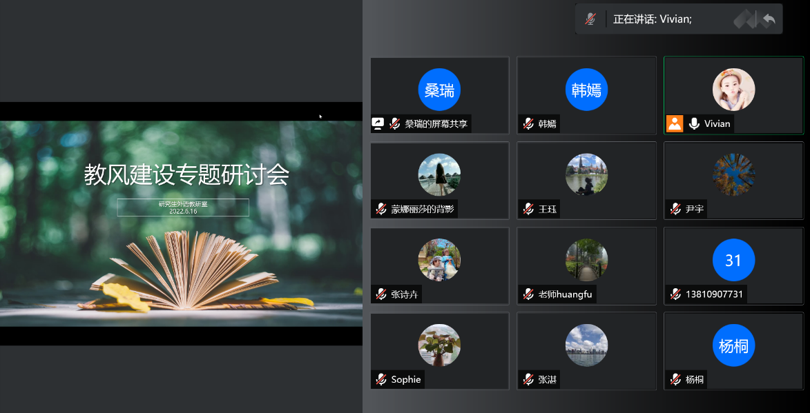 6月16日晚7:30,根据学校党委2022年全面加强学风、教风、作风建设的工作部署,基于华北电力大学《加强学风教风作风建设行动方案》(华电党[2022]18号)以及《外国语学院教风建设方案》的通知要求,研究生外语教研室在腾讯会议召开了“教风建设线上专题研讨会”,教研室主任高晓薇老师主持会议,教研室全体教师参会。