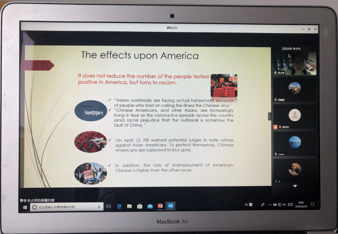 随后,英语专业教研室李占芳老师、刘朝晖老师、孟亮老师和翻译专业教研室朱安博老师、马晓颖老师和刘斌老师以各自的专业课为案例,通过《语言学导论》《英语专业导论》《文学导论》《新闻翻译》《翻译专业导论》和《口译》等课程的实践教学展示了课程思政与知识传授的相结合,把教学目标中的知识目标、能力目标、素质目标三目标中的素质目标从之前的隐性转为显性,把英语教学提升至英语教育的认识范畴,树立学生们正确的价值观、引导学生思辨,为全体老师提供了更广阔的思政教学思路,帮助老师们完成从教学到教育认知的转变。