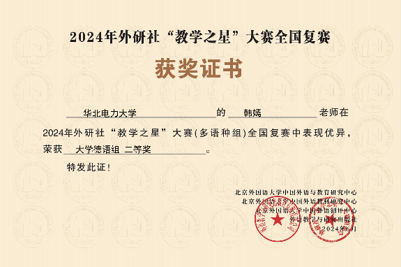 韩嫣获2024年外研社“教学之星”大赛全国复赛大学德语组二等奖