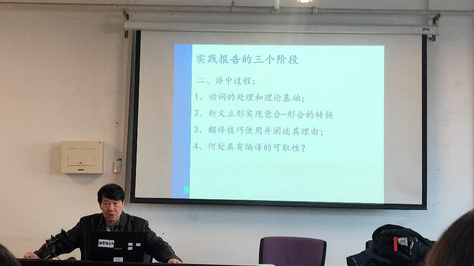 12月30日上午,我院邀请谢旭升教授在主C606作了题为“翻译实践报告撰写-以旅行社简介汉英翻译为例”的学术讲座。会议由翻译教研室副主任刘斌主持,全体翻译方向研究生和本科生聆听了讲座。
