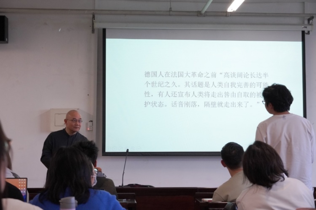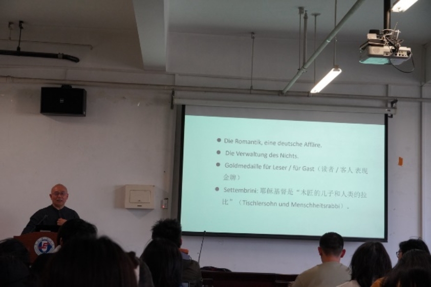 在讲座的交流与提问环节,学生们积极提问,问题涉及托马斯·曼与虚无主义、浪漫派的关系、文学翻译的策略和技巧等问题。黄教授强调,同学们要避免成为“单向度的人”,阅读无边界,不要忽视交叉阅读。另外,文学是一门快乐的学科,不仅因为其研究对象天然具有娱乐功能,更为重要的是,作为艺术,文学具有非理性的内核。文学需要文学研究者大量运用直觉、想象和诗性思维,需要投入情感。并且,文学能够锤炼我们的观察力、想象力和逻辑推理能力,更以游戏的姿态串联起经济、政治、哲学、思想和民族。本场讲座不仅激发了同学们对德国文学的兴趣,也让同学们对文学翻译有了更深刻的认识,更为他们的学术研究提供了新的视角与思路。