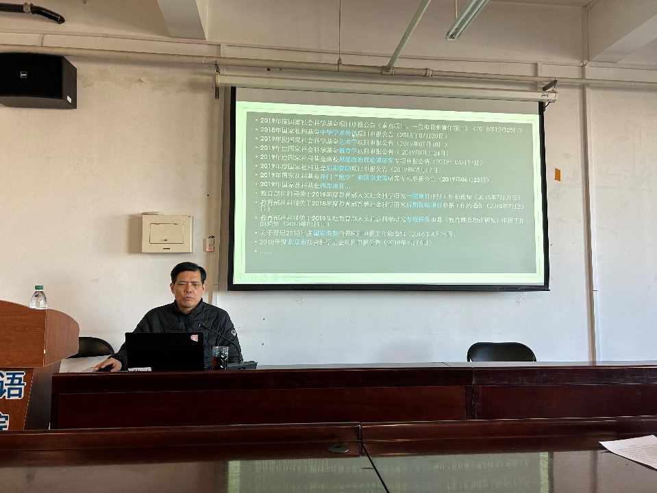 生安锋教授从国家社科基金等各类项目的选题、预备工作、申请书的撰写、申报注意事项、项目的开展及结项等方面进行了讲解。他指出,国家社科基金等各类项目的选题既要扣紧时代脉搏,又要有创意。因此,他建议申报者仔细研究往年立项名单。并且,他建议申报者应多多关注学术冷门,具备独到的眼光。在预备工作方面,生教授建议申报者应全面掌握本课题或与课题相关的国内外研究现状,在梳理过程中不能遗漏国内外的权威著作,研究综述应全面、扎实。在此基础上,申报者应提出自己研究的独到之处和创新点,突出中国学者的主体性。在申请书的撰写方面,生教授建议大家应认真严肃地填写表格,反复检查和校对申报书,避免申报书中出现硬伤。此外,申报者在撰写申报书时不要使用太多概念,少用冷僻术语,论述应言简意赅,符合汉语的表达习惯。最后,生教授对研究对象和研究目标、学术思想和学术观点进行区分,并在预期成果和参考文献的撰写方面提出了宝贵的意见。