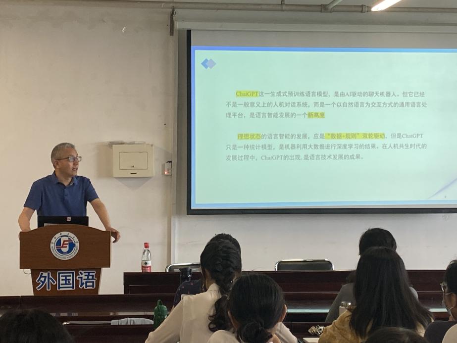 应华北电力大学外国语学院邀请,5月31日下午,北京科技大学外国语学院副院长、教授、博士生导师任虎林做了题为《ChatGPT与外语科研教学》的学术讲座。外国语学院副院长刘辉出席会议并致辞。