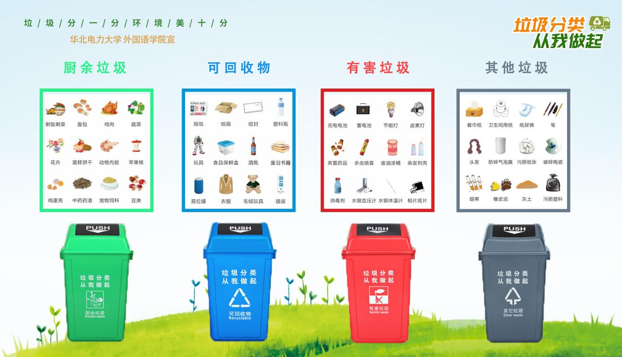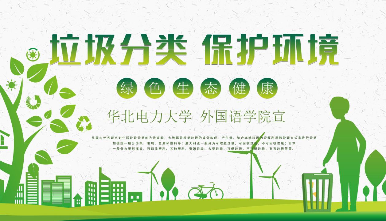 本次垃圾分类宣传教育活动,得到了华北电力大学外国语学院全体师生积极参与,按照学校有关要求,结合外国语学院实际,成立了学院垃圾分类领导小组,动员各教研室、党支部、团支部和学生班级共同推进垃圾分类工作。努力做到全院动员,全员参与,全力以赴,以期能做到在宣传与实际活动中,使同学充分了解垃圾分类的意义,知道如何进行垃圾分类,并能够自觉树立“垃圾要分类”的意识,为北京生态建设贡献力量。