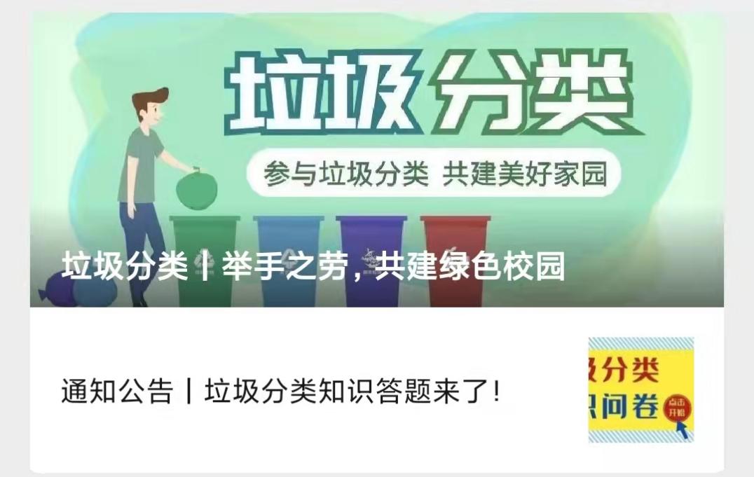 另外,针对垃圾分类的相关知识,学院还设置了线上知识竞答比赛。对于成绩优异的师生给予了奖励,同时也增进了学院师生的知识储备与践行垃圾分类的热情,力求通过这样的方式让我院的垃圾分类工作行有成效。
