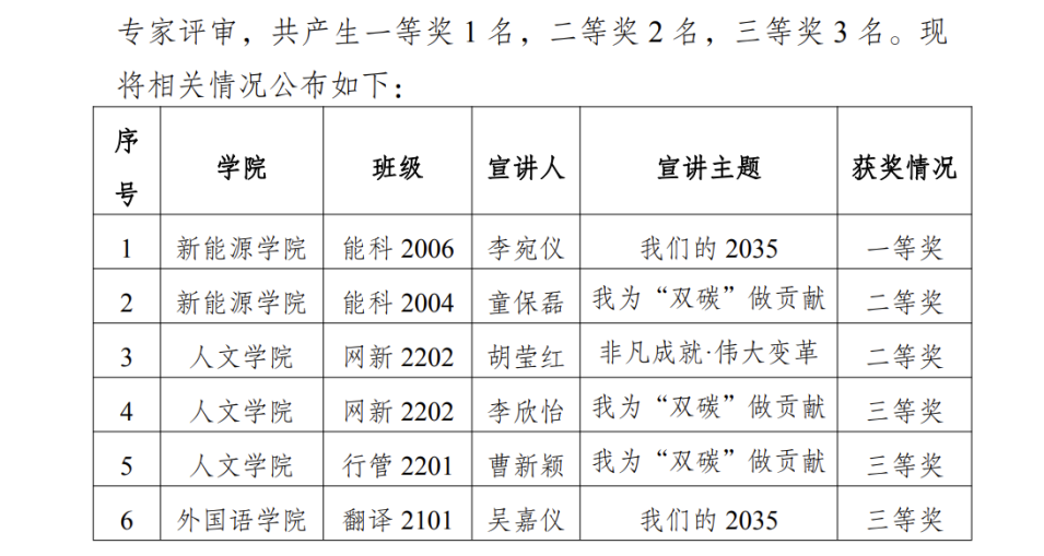 2023年暑期,为深入开展学习贯彻习近平新时代中国特色社会主义思想主题教育,带动全体学生深刻把握新时代伟大成就、增强践行“两个维护”自觉,推动落实“时代新人铸魂工程”,华北电力大学举办第二届微宣讲大赛,鼓励同学们以不同角度述见闻、讲故事,旨在培养与新时代同向同行、共同前进,有理想、敢担当、能吃苦、肯奋斗的新时代好青年。自赛事举办以来,学院深入各团支部进行推广宣传,组织学生积极备赛并打磨作品。11月中旬,华北电力大学第二届微宣讲大赛评审结果出炉,外国语学院吴嘉仪同学的作品“我们的2035”获得校级三等奖。