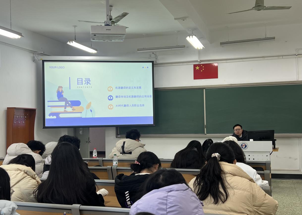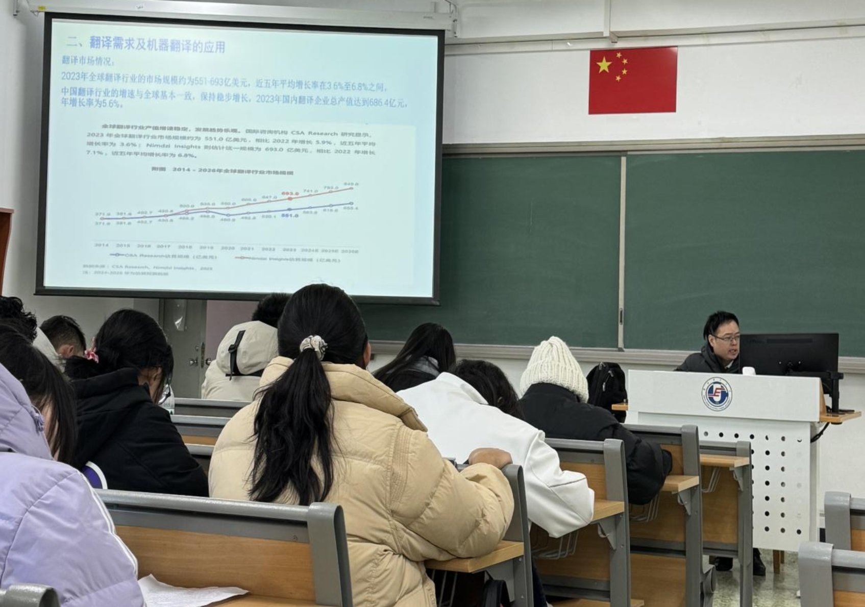 科大讯飞袁老师围绕机器翻译的定义和发展、翻译市场及机器翻译的应用场景、AI时代翻译人员的职业选择等三个方面,介绍了当前 AI 技术在外语教学、翻译实践及语言分析中的实际应用,还与同学们共同探讨了 AI 在外语领域的广阔发展前景。科大讯飞的专业讲师深入浅出地为同学们讲解了AI技术在外语学习、翻译、语言研究等多方面的应用现状及未来发展趋势。