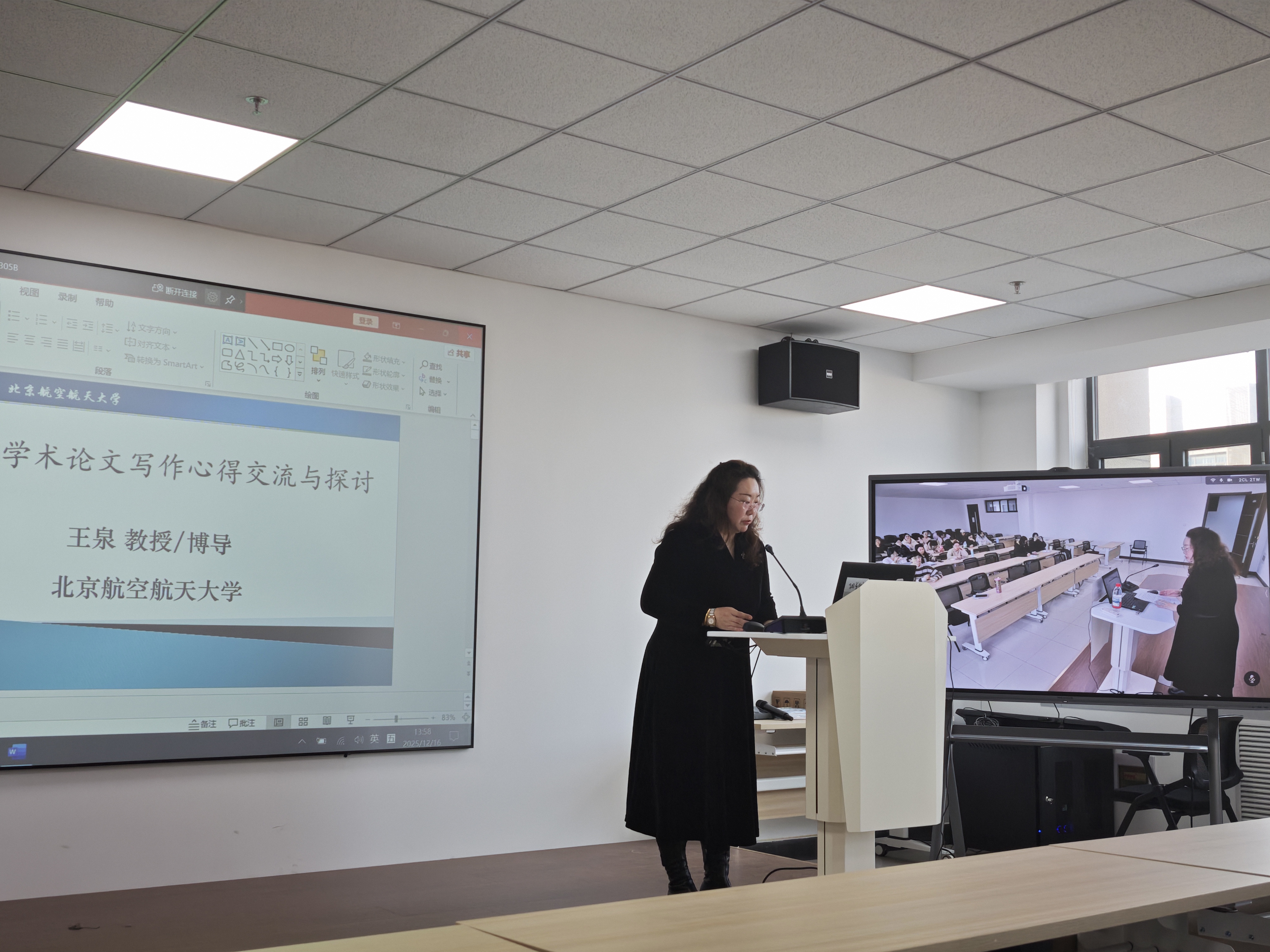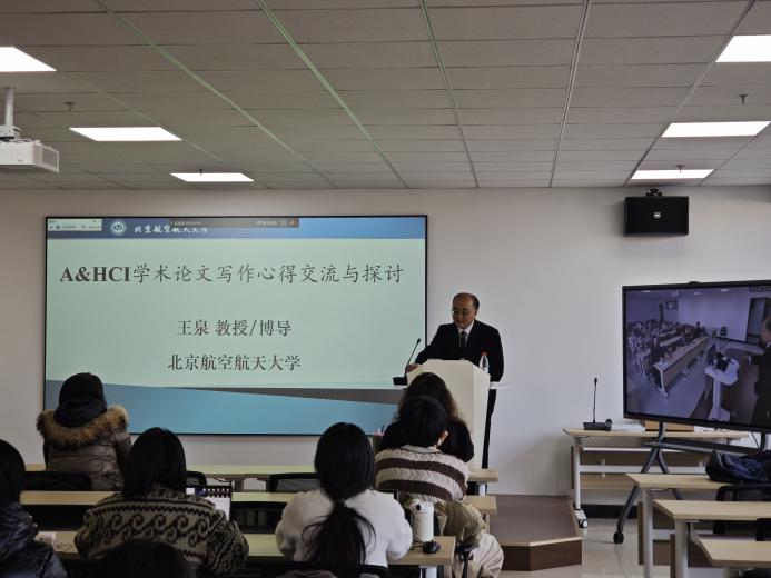 12月16日下午,外国语学院特邀北京航空航天大学外国语学院王泉教授,为我院师生做了题为“A&HCI学术论文写作心得交流与探讨”的学术讲座。讲座由学院副院长刘辉主持。