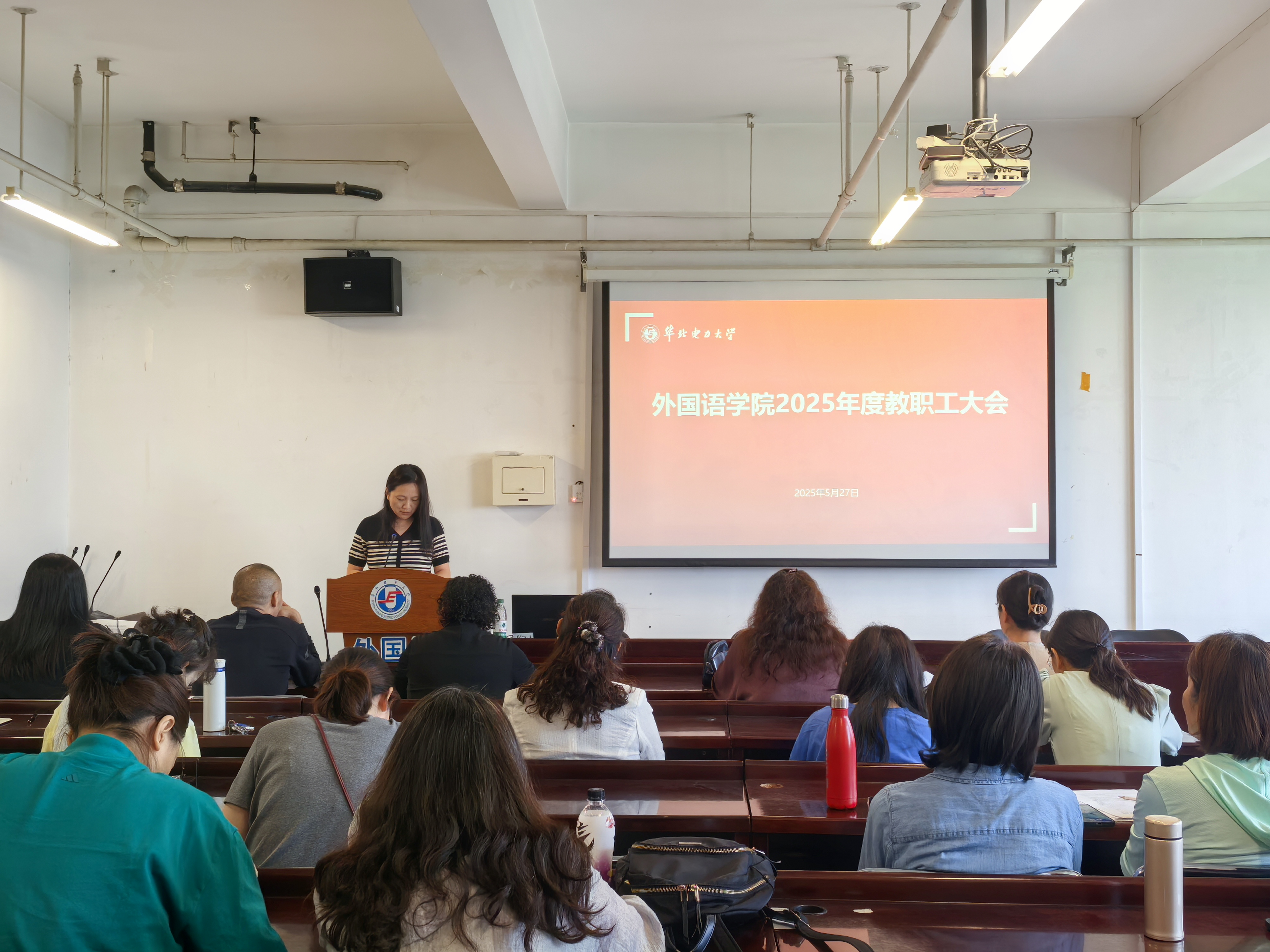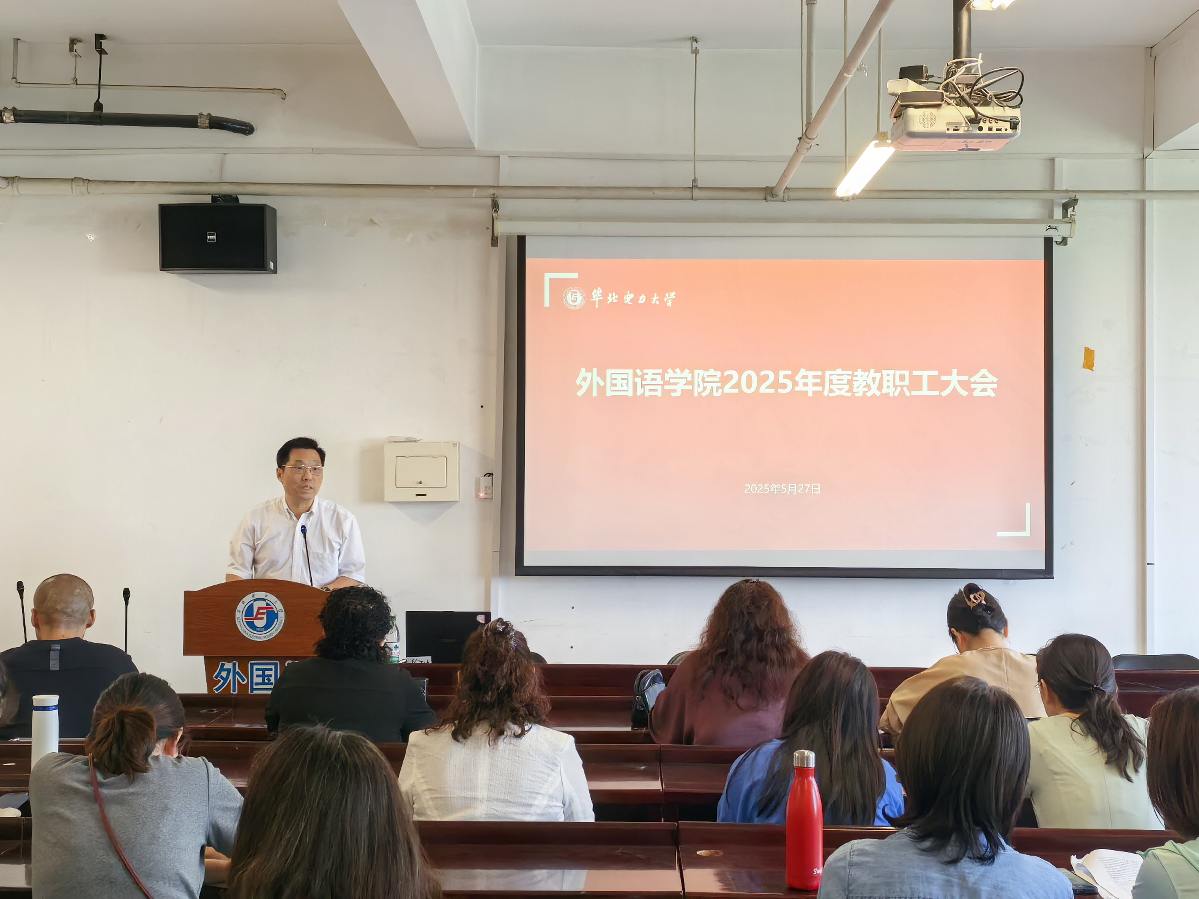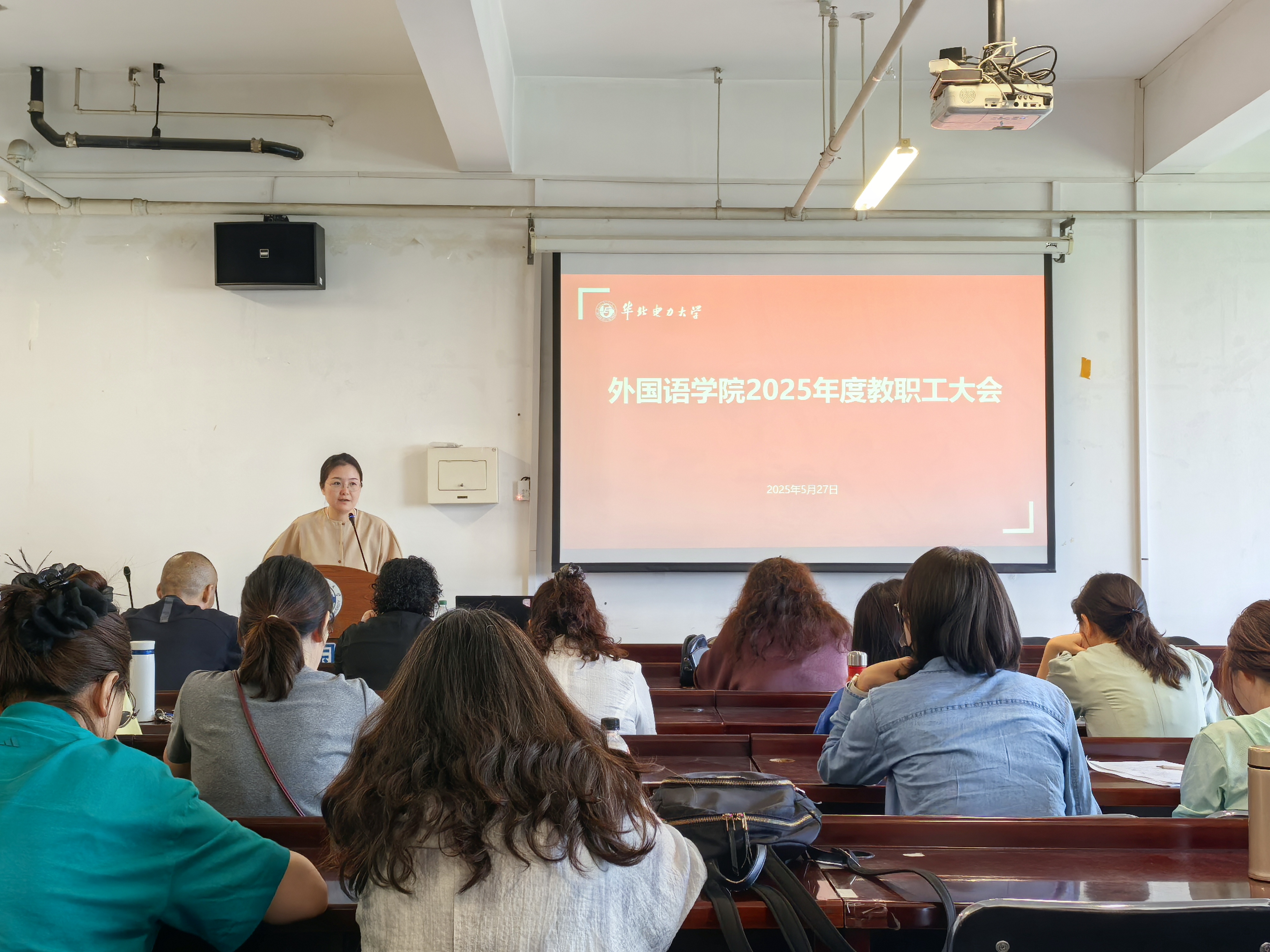 5月27日下午,外国语学院召开2025年教职工大会,学院领导班子成员及全体教职工参加会议。会议由工会副主席王晴晴主持。