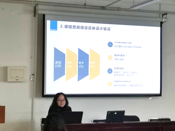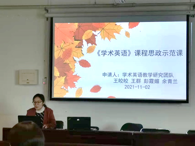 王皎皎代表《学术英语》思政团队介绍了课程建设情况,团队成员包括王群,彭霞媚和余青兰老师。王老师重点介绍了此团队教师多人多次参加校内外中青年骨干教师研修班,尤其重视课程思政方面的研修情况。根据学校和学院对课程思政提出的要求,在教学大纲的基础上融入时事政治、社会热点事件、社会热点人物等结合现实生活,注重加强道德修养,提升育人素养,落实立德树人的根本任务。讲评时有评委提问如何将历史英雄人物与课程相联系?王老师回答,曾让学生在课堂中分享参观爱国将领故居的照片并鼓励全班同学了解英雄人物及其事迹,以此来充分调动学生的积极性与自主性,落实思政建设。