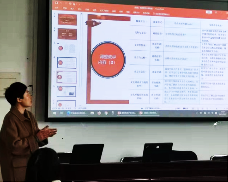刘朝晖老师代表的《英语精读》为我们举了课堂中的实例来展示团队课程思政方面的深入研究。刘老师讨论了大学之道,大学之道在于挖掘人的优秀品德,在课堂中与学生探讨思政话题,从细微的点出发,通过让学生探讨,最终落实到深刻的话题上。这既提升了学生的英语能力,又将正确的价值观传递给了学生。刘老师还展示了英语精读课的优势例如课时长,学年长,更容易产生与学生之间的心灵碰撞,产生思想上的交流,以加强制度自信和文化自信。