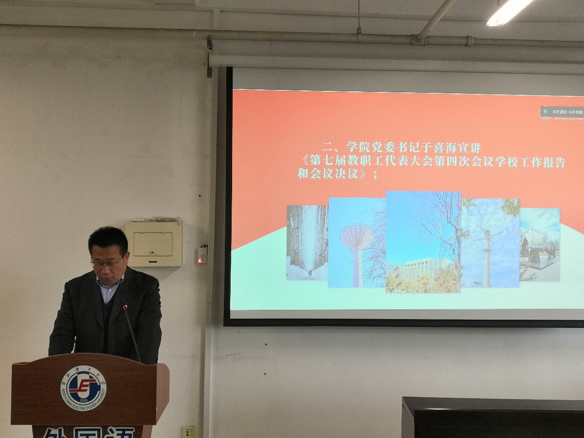 3月29日下午,外国语学院通过线上视频会议与线下现场会议相结合的形式,举行2022年春季教职工大会。学院党委书记于喜海传达了《第七届教职工代表大会第四次会议学校工作报告和会议决议》精神。他表示,2022年是国家、社会与学校的关键一年,根据《第七届教职工代表大会第四次会议学校工作报告和会议决议》精神,我们应聚焦人才培养、重大科研平台建设、创新机制、增强实效、制度深化改革,统筹资源优化保障,以更加优良的学风与高质量治理推动高质量建设行稳致远。并通报学校新冠疫情防疫政策,要求建立防疫志愿者队伍,开展防疫操作培训,强化监督检查与整改落实,确保疫情防控全覆盖。