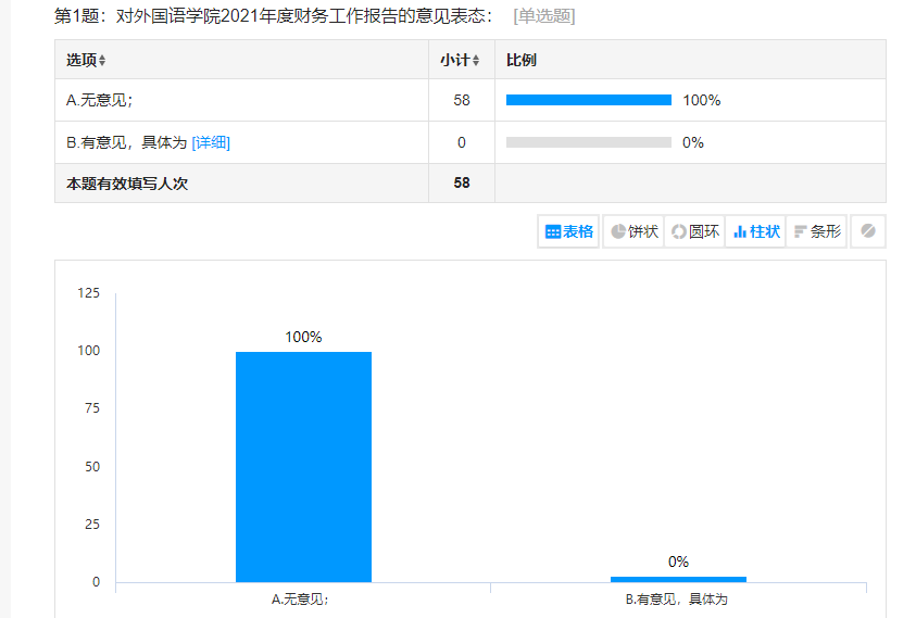 5月19日至31日,外国语学院利用问卷星小程序,组织全院教职工审议学院2021年度财务工作报告。截止6月1日,完成投票教职工人数58人,超过了学院教职工总人数的三分之二;对于财务工作报告无意见58人,对于财务工作报告有意见0人。
