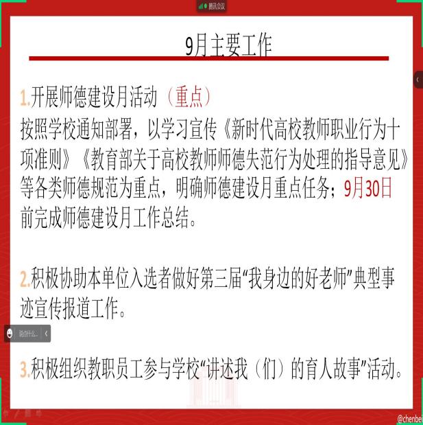 会议第二项由支部书记陈蓓传达学校“教师手册”相关要求,并布置9月重点工作,提出工作要求。