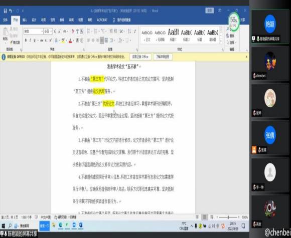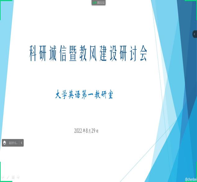 根据学校《关于开展科研诚信与作风学风建设专项整治活动的通知》要求,大学英语第一教研室联合党支部于2022年8月29日晚以腾讯会议的方式组织学习《科研诚信和作风学风建设相关文件》,并开展主题研讨会。全体教研室在岗教师参加了会议,会议由教研室主任张倩主持。