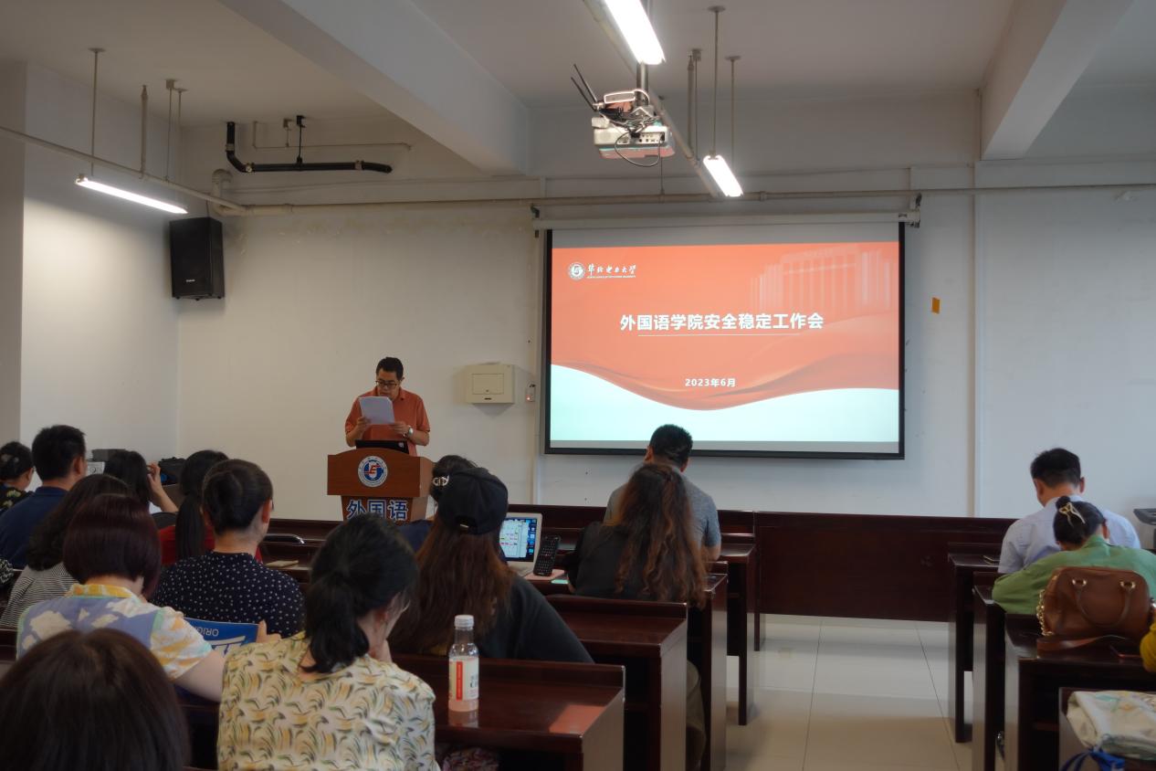 为进一步做好学院安全稳定工作,确保师生身心健康和学院各项工作推进平稳有序,强化师生安全责任意识,2023年6月28日下午16时,外国语学院在主C606召开安全稳定工作会,学院领导班子成员、全体本科生班主任及研究生导师参与会议,会议由学院党委副书记马冬主持。
