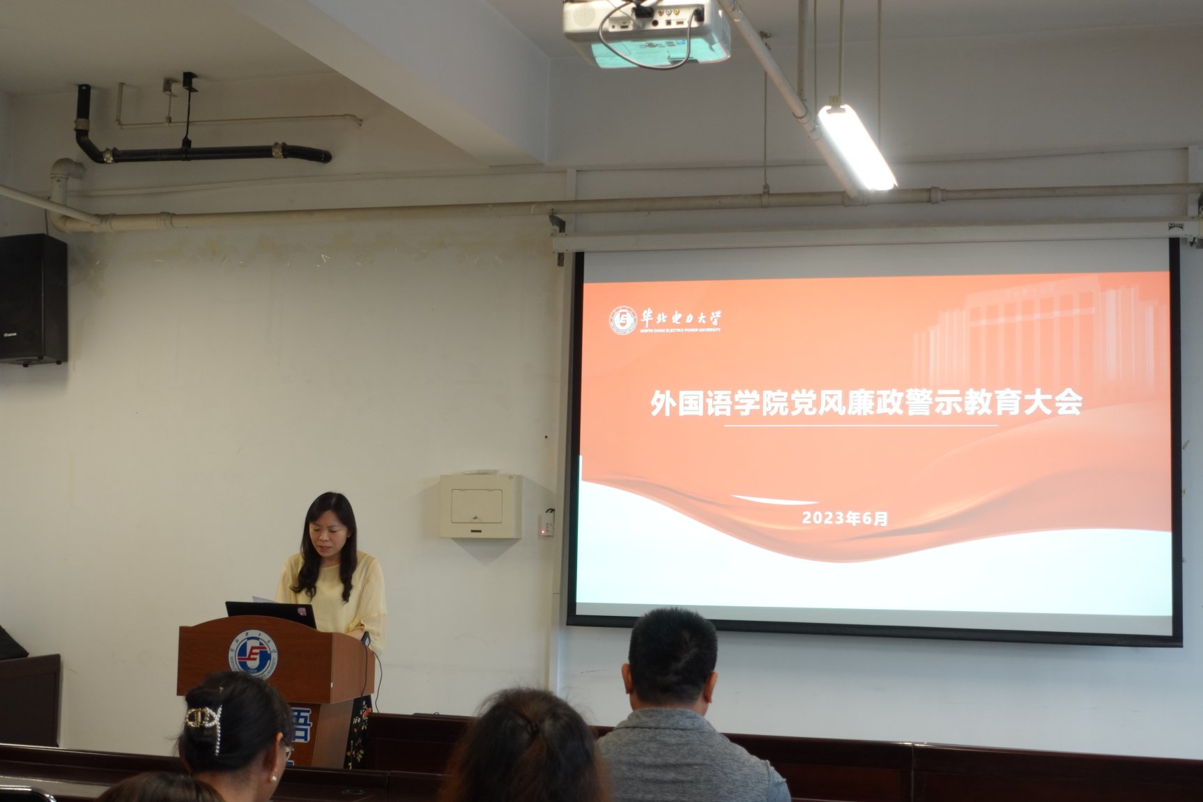 为深入学习贯彻党的二十大精神和学习贯彻习近平新时代中国特色社会主义思想主题教育,落实学校全面从严治党工作会议精神,深化学院党风廉政建设,加强警示教育,营造风清气正的育人环境,6月28日下午15时,外国语学院在主C606会议室召开党风廉政警示教育大会,会议由学院副院长张倩主持。