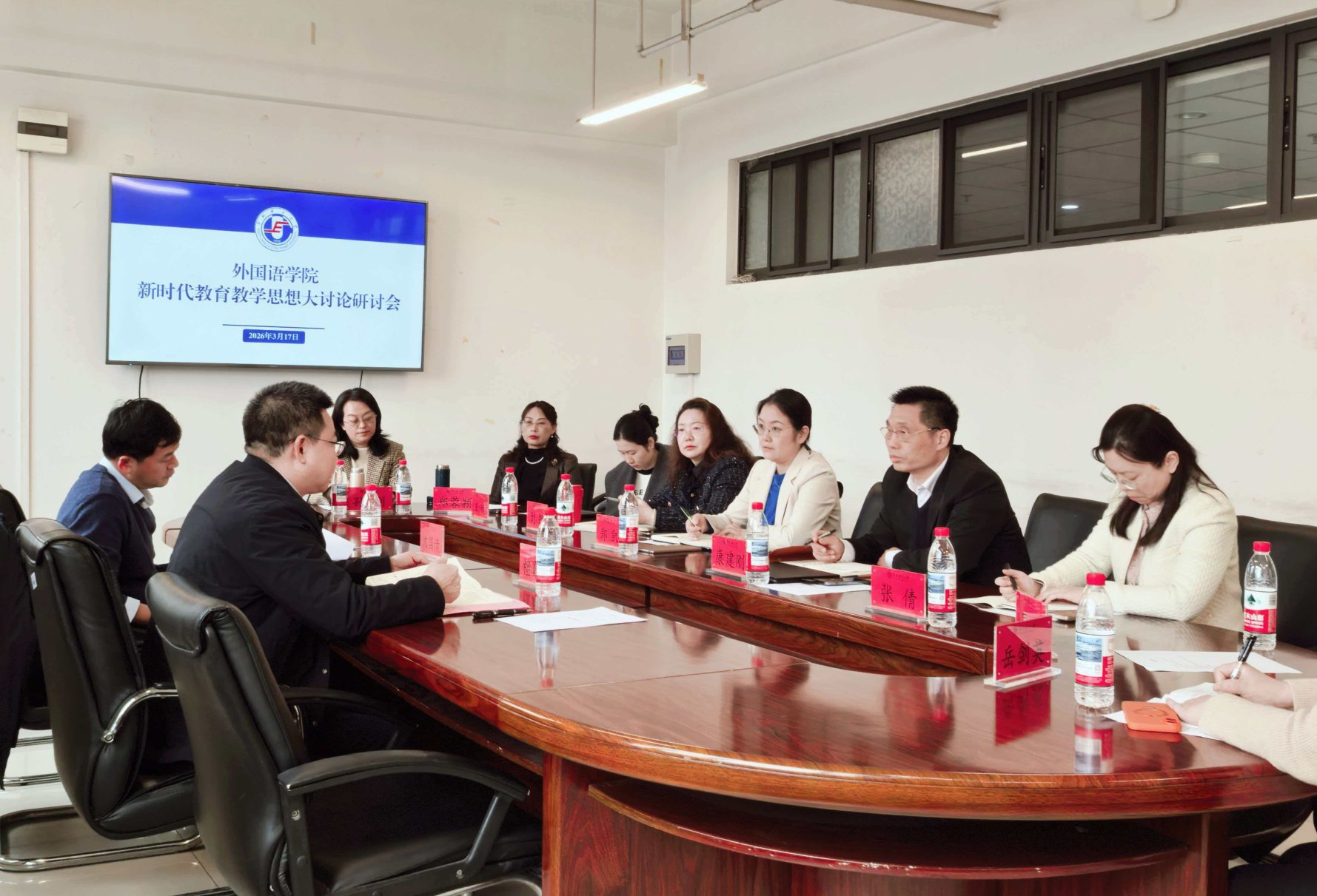 3月17日下午,外国语学院新时代教育教学思想大讨论专题研讨会顺利召开。学校党委常委、副校长檀勤良、教务处副处长沈国清出席会议,外国语学院班子成员、各教研室主任、党支部书记及骨干教师参会。会议由学院党委书记郑凯主持。