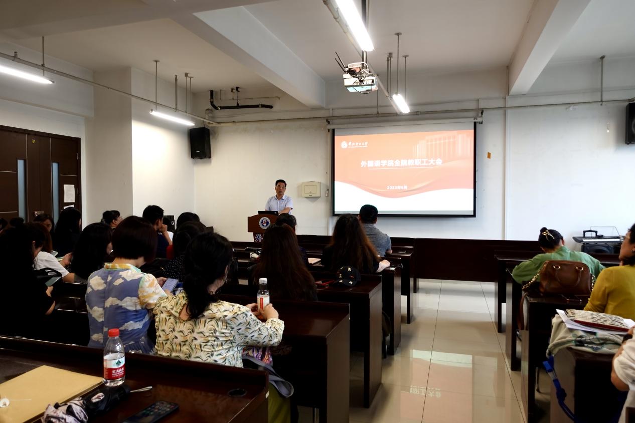 为了进一步提升学院教育教学质量和科研水平,加强学院教职工团结和凝聚力,2023年6月28日下午13:30,外国语学院在主C606会议室召开2023年春季学期第二次全体教职工大会。会议由学院院长康建刚主持,学院全体教职工参加大会。