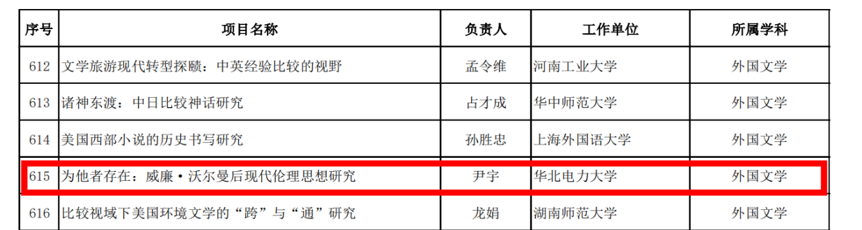 获得立项的分别是我院尹宇老师和王珏老师。其中,尹宇老师的《为他者存在:威廉·沃尔曼后现代伦理思想研究》获后期资助项目立项;王珏老师的《十七世纪德国巴洛克戏剧中“君权”观念研究》获青年项目立项。