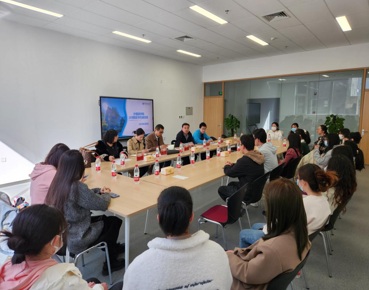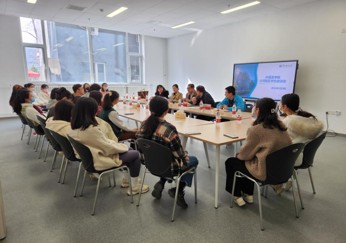 会议伊始,马博老师对外国语学院三位领导老师的到来表示欢迎。会中,马冬老师向沙河院区的各位同学表达亲切问候,认真聆听学生代表发言,与会学生代表结合院区实际情况从学习、住宿、饮食、就业等方面表达了各自的想法。座谈中同学们提出的问题,老师们进行了现场回答。对学生们的建议和意见,老师们表示会认真考虑,积极沟通并做出改进,尽最大可能满足同学们的合理需求。通过本次座谈会,同学们畅所欲言,表达了对沙河院区的关注和期许,学院和院区也将以此次座谈会为契机,梳理同学们在学习生活中的问题,提出切实可行的改进方案,扎实做好各项工作。