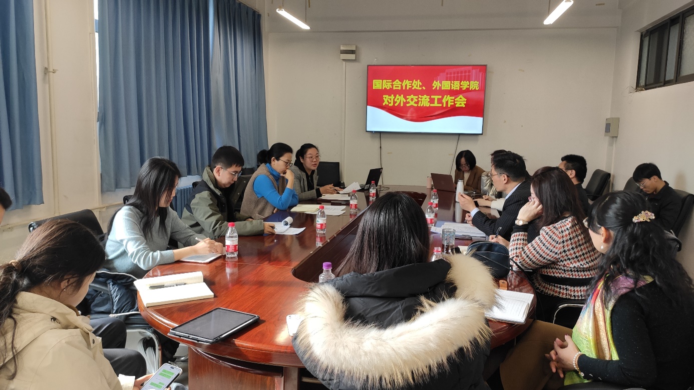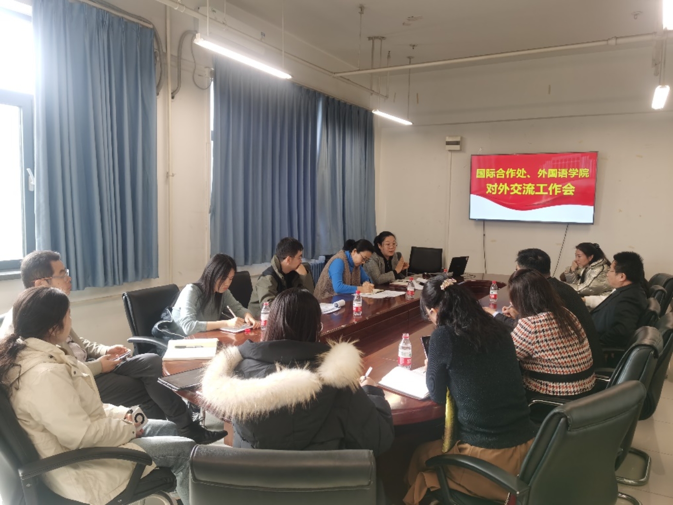 3月4日下午,校国际合作处处长李博、外国专家科彭飞、国际交流科李芊芊一行到访外国语学院共商对外交流工作。外国语学院党委书记于喜海、院长康建刚、副院长刘辉、张倩及各教研室主任参会。