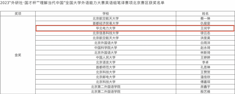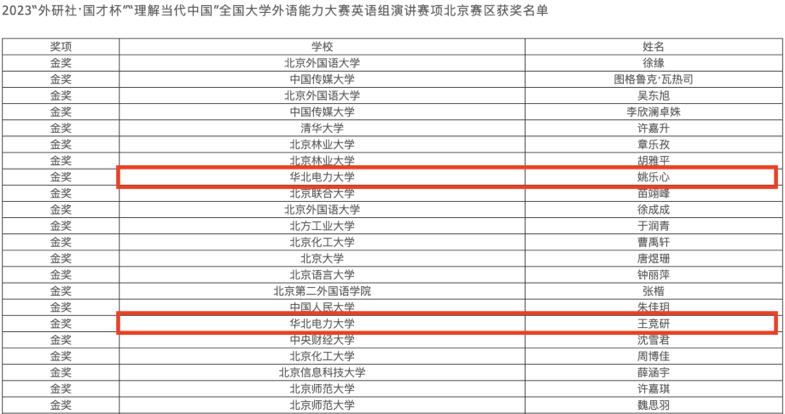 在本届比赛中,华电学子共斩获金奖3项、银奖7项、铜奖7项,在所获奖项类别和数量方面均取得新突破。其中,来自外国语学院的王闰宇以全省第三名的成绩在英语组笔译比赛中获得金奖;来自外国语学院的姚乐心和经济与管理学院的王竞研在英语组演讲比赛中获得金奖,取得历史最好成绩。三位金奖获得者将代表北京赛区角逐全国总决赛。