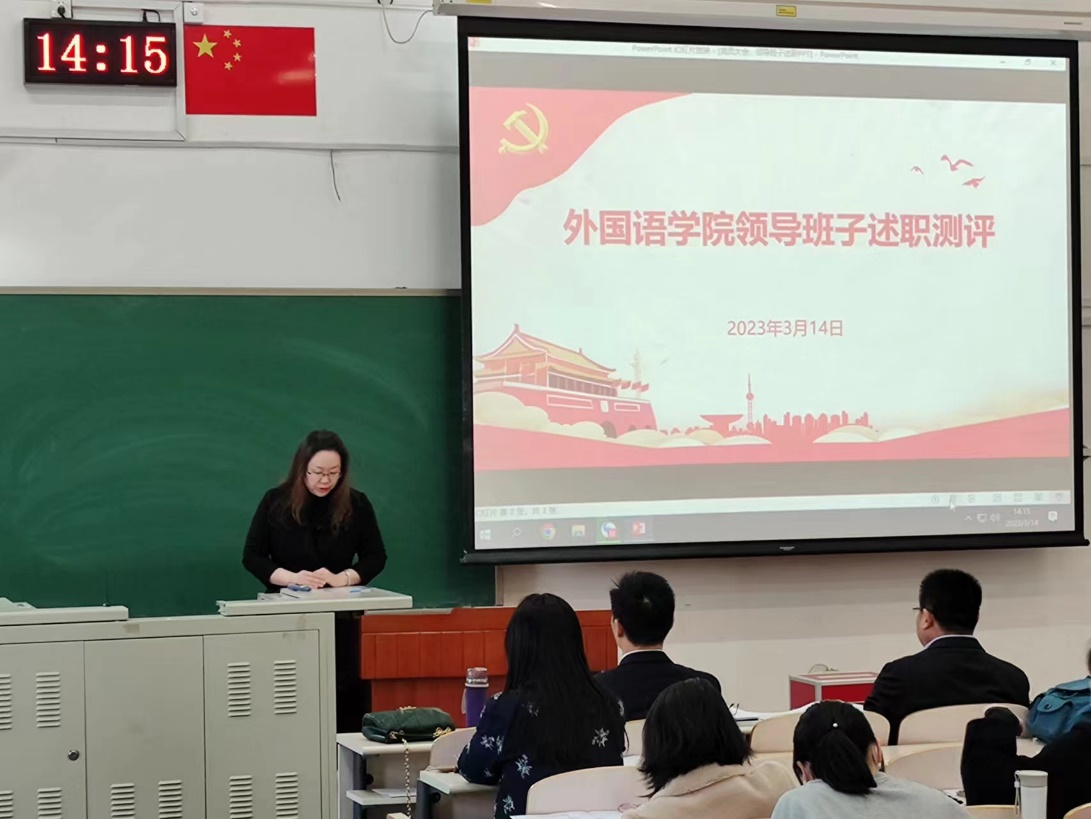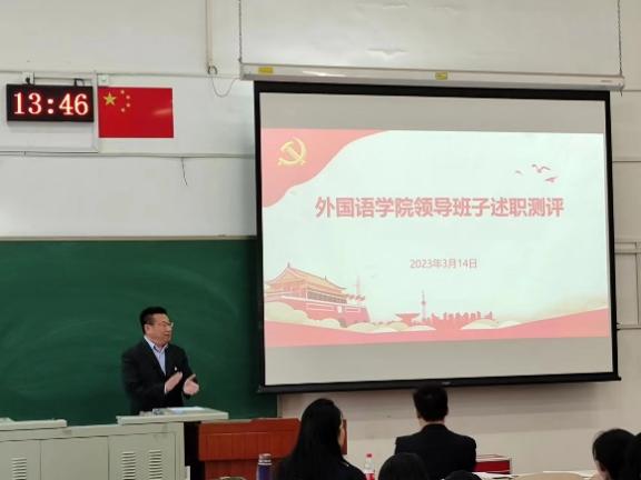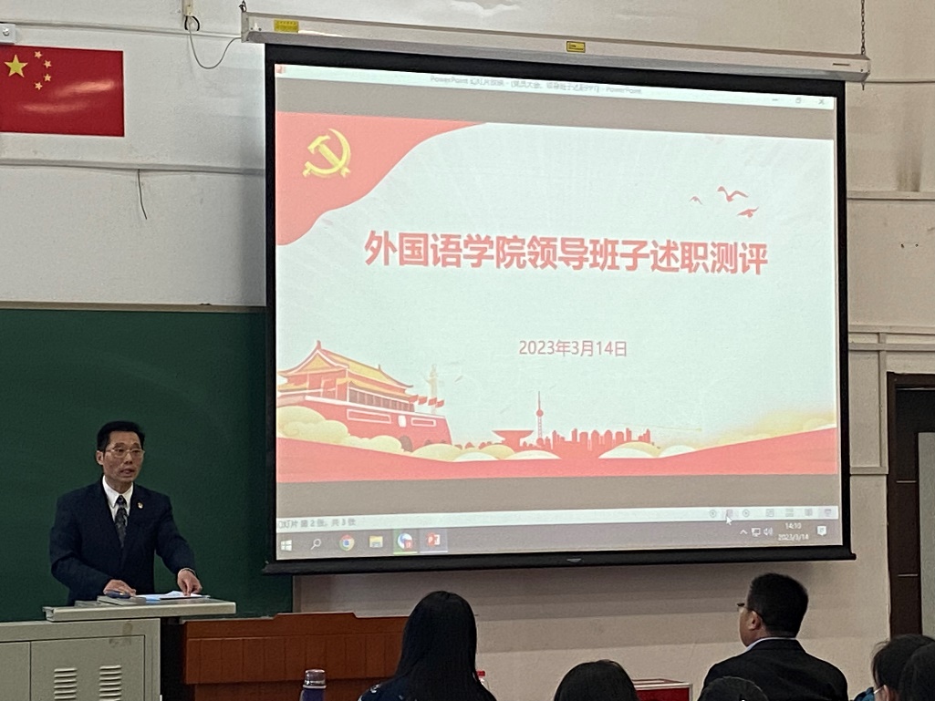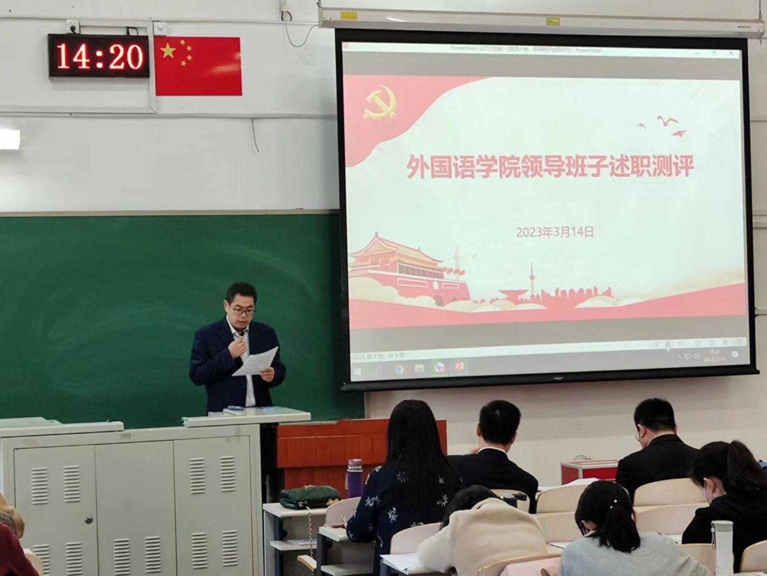 3月14日下午13:40,外国语学院2022年度领导班子和处级领导述职大会在主楼C203召开。外国语学院领导班子成员及学院全体教职工参加会议,会议由学院党委书记于喜海主持。