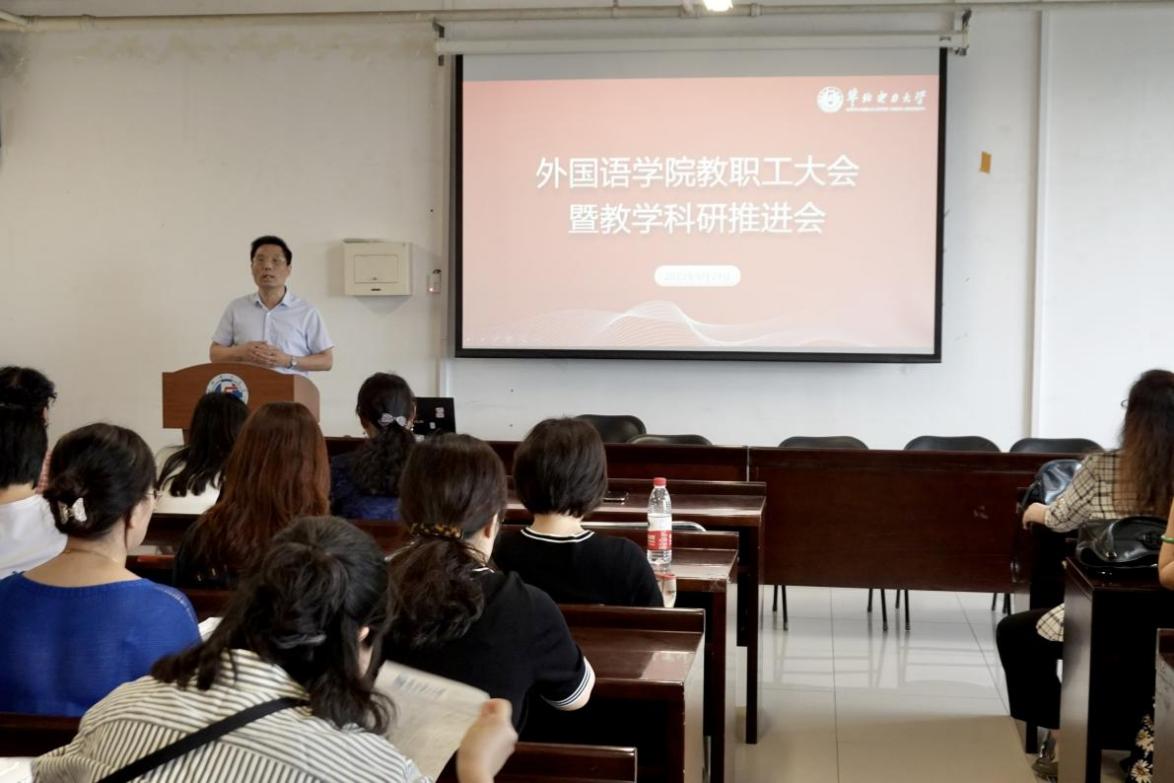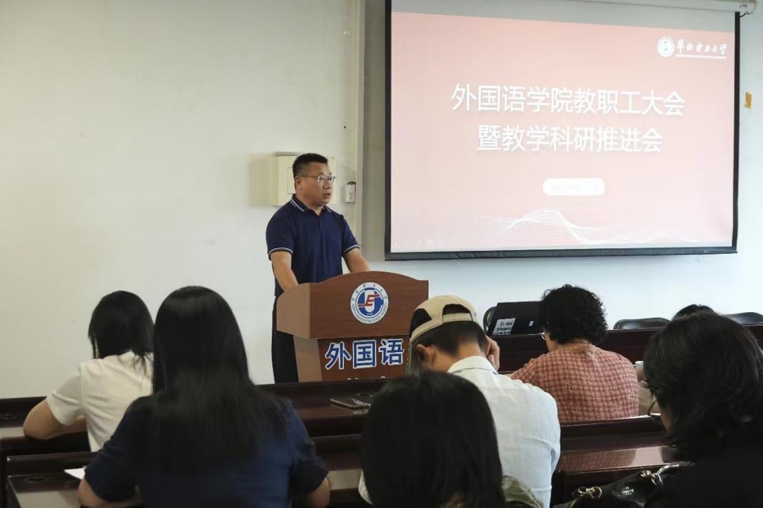 康建刚向全体教职工隆重介绍了2023年新入职的五位教师,对他们加入外国语学院大家庭表示热烈欢迎。随后,他简要总结了上一学年学院各项工作取得的成果,充分肯定了学院全体教师求真务实、拼搏进取的工作精神。对于新学期的工作,他希望全体教职工继续以饱满的热情和昂扬的状态投入到工作岗位中,为实现新学期的工作目标开好局、迈好步。