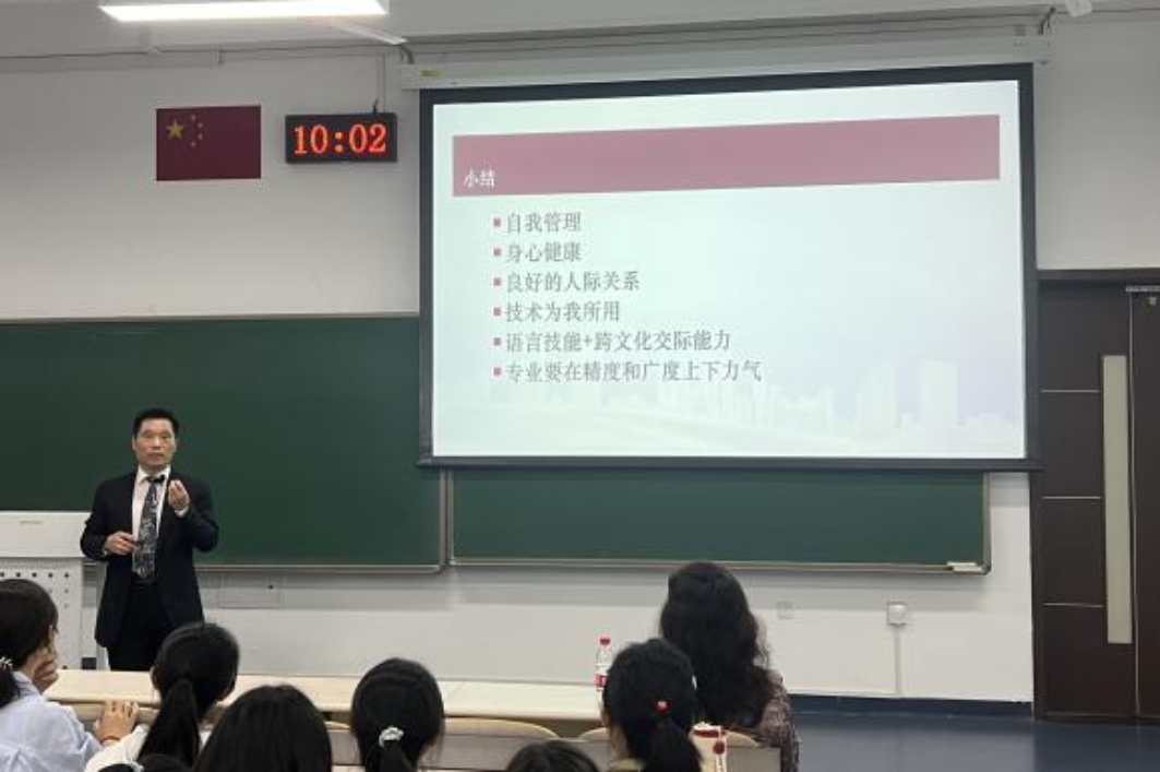 康建刚强调文化交流的重要性,指出学习一门语言必须深入理解其背后的文化内涵,跨文化交际能力的重要性不言而喻。另外,康建刚也希望同学们时时刻刻关注自己的身心健康,并提出一系列可行性建议,鼓励大家培养兴趣爱好,适度参与锻炼,成功通过游戏中的第六关和第七关。