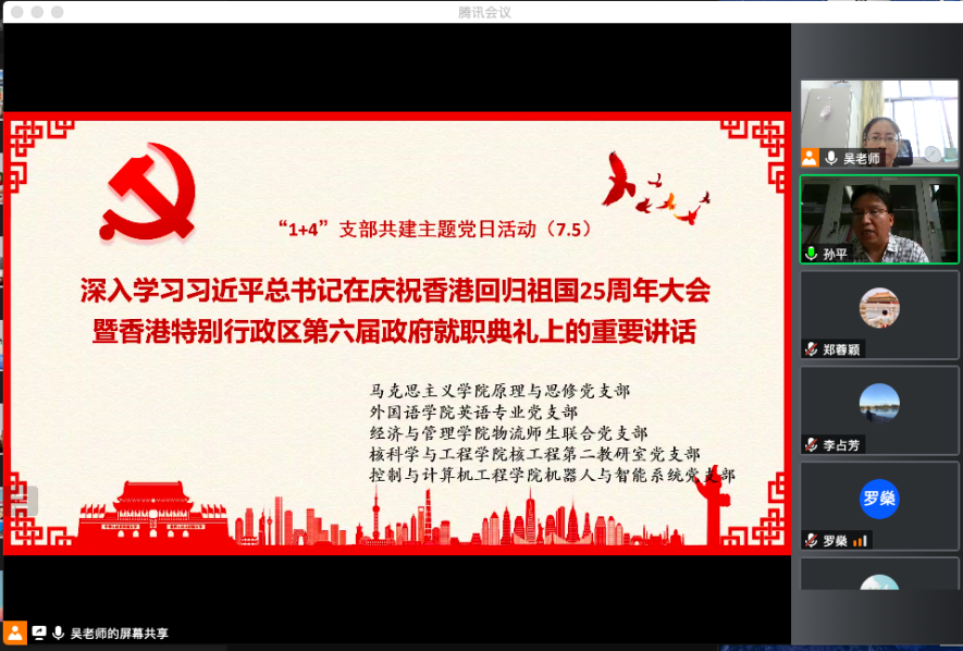 2022年7月5日,马克思主义学院原理与思修党支部、核科学与工程学院核工程第二教研室党支部、控制与计算机工程学院机器人与智能系统党支部、外国语学院英语专业党支部、经济与管理学院物流师生联合党支部五个支部组织了在线的主题党日活动,本次活动共有52名老师参加,由马克思主义学院原理与思修党支部书记吴宁宁老师主持,特别邀请了马克思主义学院党总支孙平书记与会。