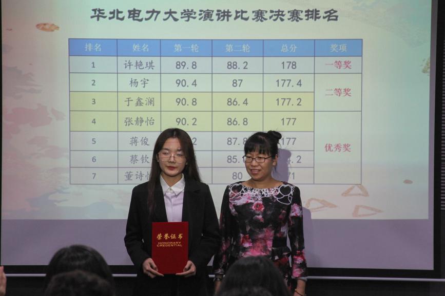 比赛评分结算后,许艳琪选手脱颖而出,获得了一等奖。赛后,李一坤评委老师进行了本次演讲比赛的点评与总结,对参赛选手们的付出与准备给予了高度评价,鼓励同学们再接再厉,不断提高自己的英语水平,增强自己的表现力,在面对比赛与观众时能够放松坦然。而后由其他评委老师们上台为各位获奖选手颁奖。