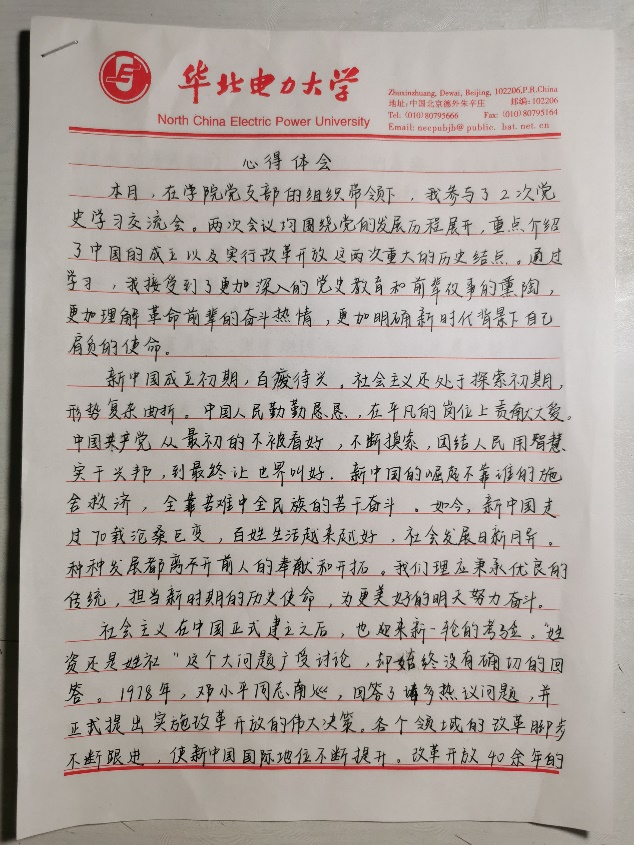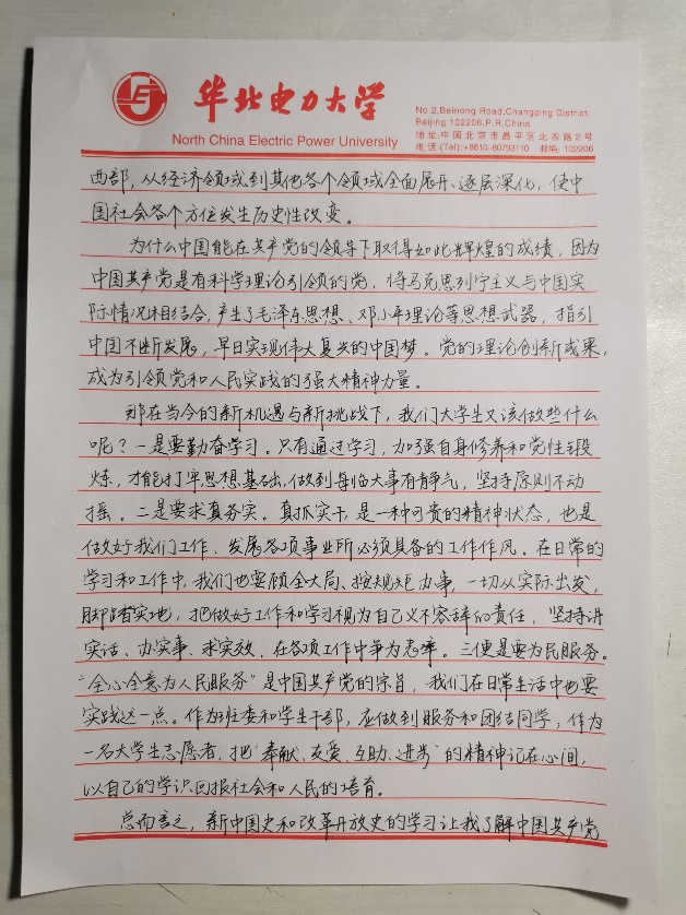 陈星羽同学认为,通过这几次党课学习,我对中国共产党的历史和精神有了更加清晰深刻的了解和认识,以史鉴今,资政育人。通过“四史”学习,我们既可以得出一些有利于党和国家发展的经验教训,也能够从中汲取精神力量、坚定理想信念。作为一名大学生,我要做的就是通过“四史”学习,了解党和新中国的发展历史,领悟党的精神,从而在生活中成为一名合格的党员,更好地服务同学。