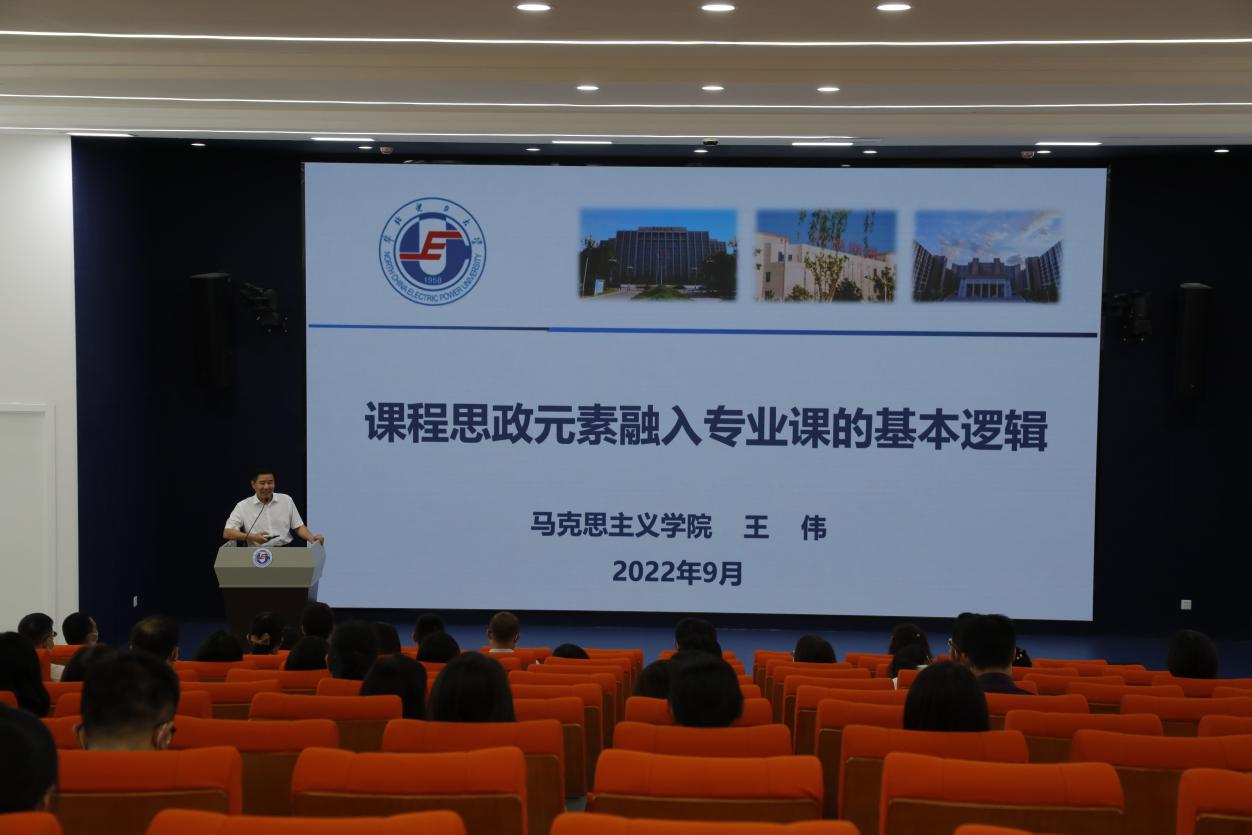 王伟作了题为 《课程思政元素融入专业课的基本逻辑》的专题报告。王教授从理论层面深入阐述了课程思政元素融入专业课的政治逻辑、内容逻辑、专业逻辑、价值逻辑、历史逻辑。他指出高校教师要深入落实立德树人根本任务,紧紧围绕为党育人为国育才目标,通过全员、全程、全方位对课程进行深层次改革,实现知识传递和品德塑造相统一。